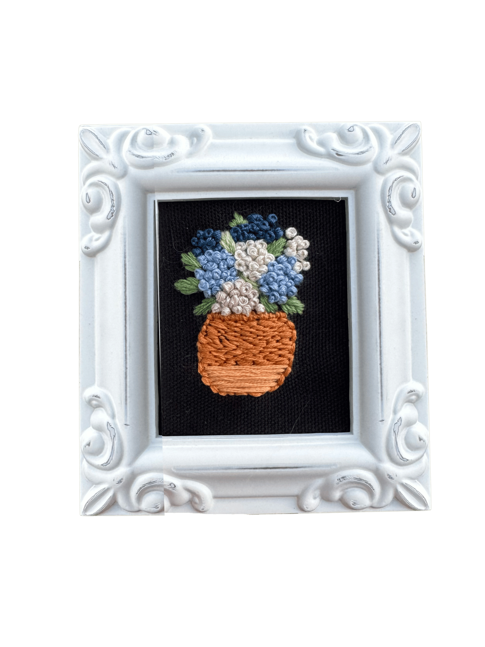 Multi colored hand embroidered floral bouquet stitched on small linen square pieces - vase is painted with acrylics in green blue.